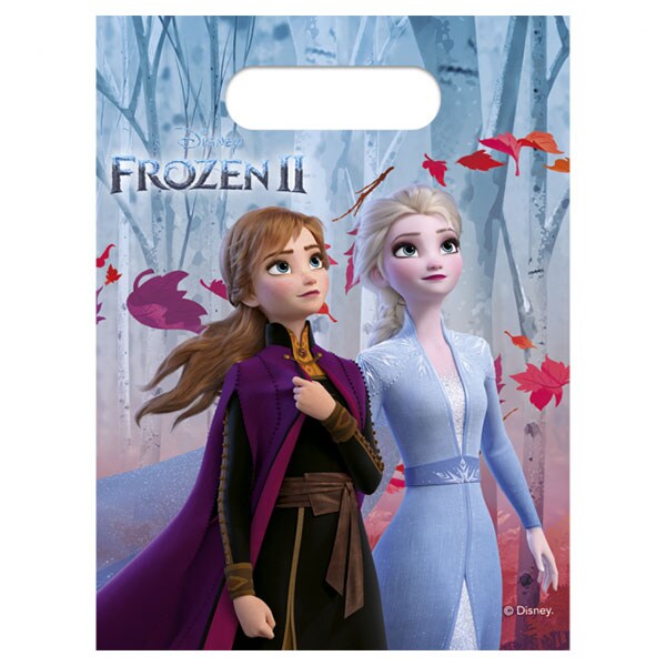 6 festposer med flotte farver og et sejt motiv af prinsesserne Anna og Elsa fra filmen Frozen 2. Fyld poserne med slik og sjove overraskelser, og del dem ud til dine venner under festen.