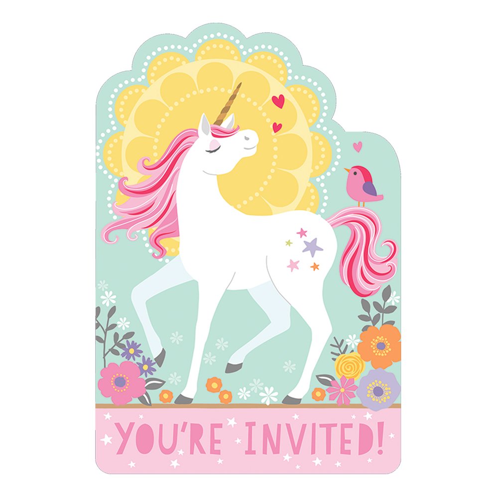 Indbydelseskort Magisk Enhjørning indeholder otte styk formskåret indbydelseskort i forskellige pastelfarver med en enhjørning på. På kort står der “You’re invited” med lyserøde bogstaver. Kortet er lavet i papir og er 10,7 x 15,8 cm. Der medfølger kuvert og klistermærker til at lukke kuverten med.